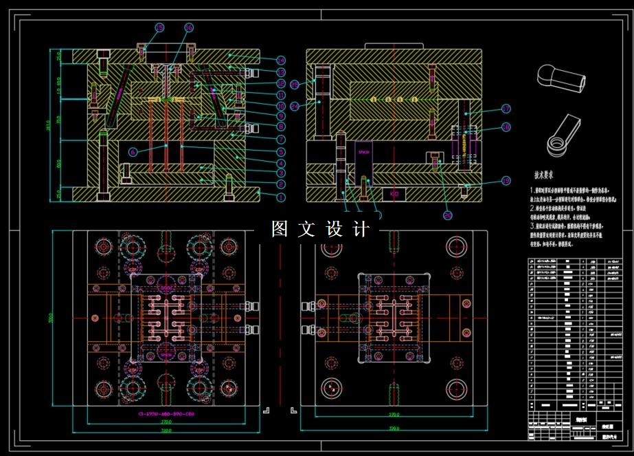 本次设计在针对产品进行工艺性分析后,确定模具分 型面、 型腔数目、 浇口形式、 位置大小; 其中最重要的是确定型芯和型腔的结构, 以及它们的定位和紧固方式。此外还进行了脱模机构的设计,合模导向机构的设 计,冷却系统的设计等。最后绘制完整的模具装配总图和主要的模具零件图及编 制成型零部件的制造加工工艺过程卡片。实践证明:该模具结构合理、可靠,并 能保证产品质量,对此类注射产品的模具设计有参考价值。