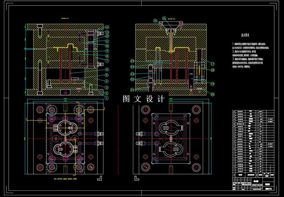 本说明书还详细叙述了模具结构方案,包括确定分型面、成型零部件的结构设计、脱模机构、合模导向机构、冷却系统等等的设计过程。还有重要零件的工艺参数的选择与计算。校核注射模与注射机的关系等。