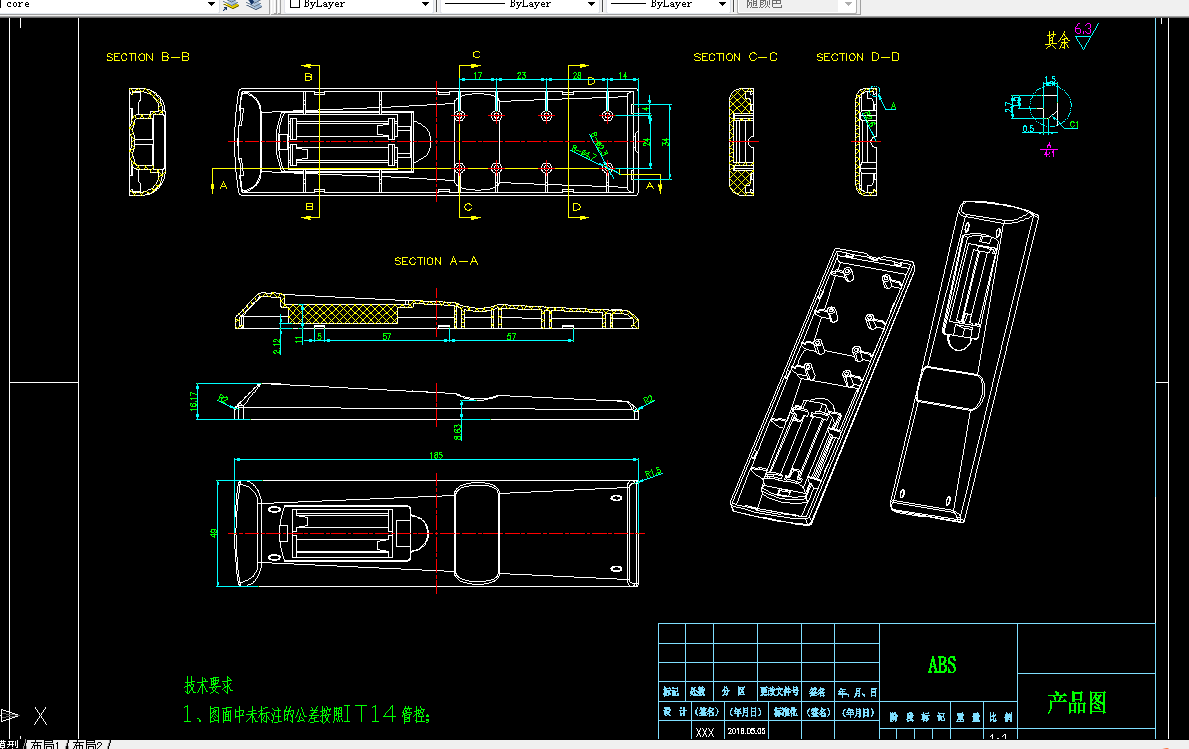 关键词 单分型面注射模具 电视遥控器后壳 ABS