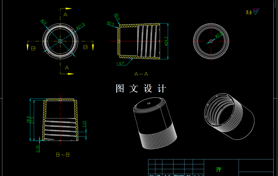 本次设计的产品为胶水瓶盖,具有重量轻,强度高,耐腐蚀,易清洁等 特点,为大批量生产产品。本次设计在针对产品进行工艺性分析后,确定模具分 型面、 型腔数目、 浇口形式、 位置大小; 其中最重要的是确定型芯和型腔的结构, 以及它们的定位和紧固方式。此外还进行了脱模机构的设计,合模导向机构的设 计,冷却系统的设计等。