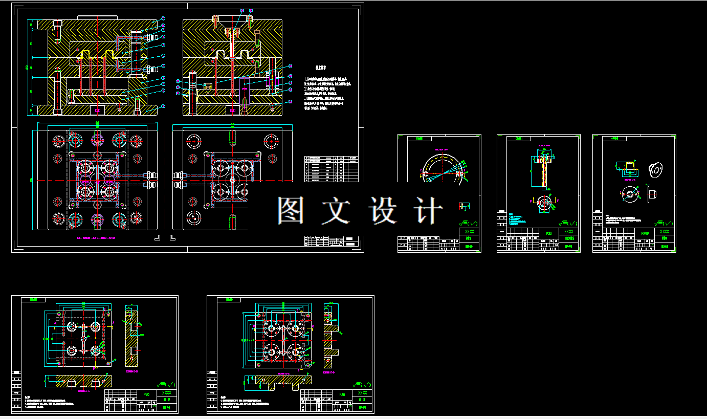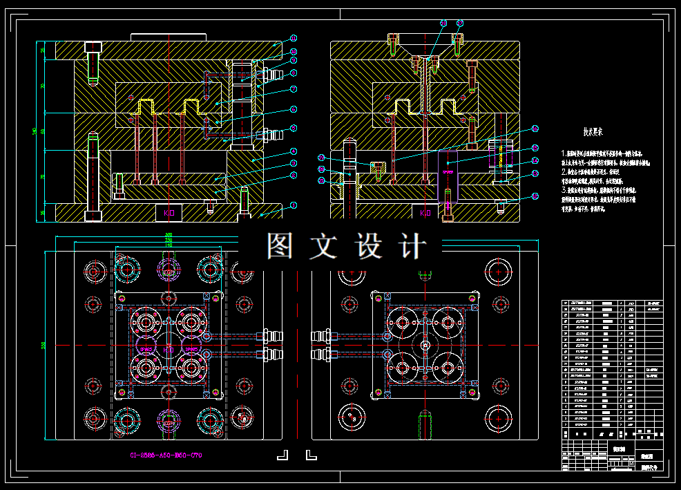 采用一模四腔,侧进胶,推杆推出的设计方案。 在完成全套的模具结构设计之后,对其生产所需的注塑机进行了选择与校核,其中校核项目包裹注塑量、注塑压力、锁模力、安装尺寸、顶出行程等内容。