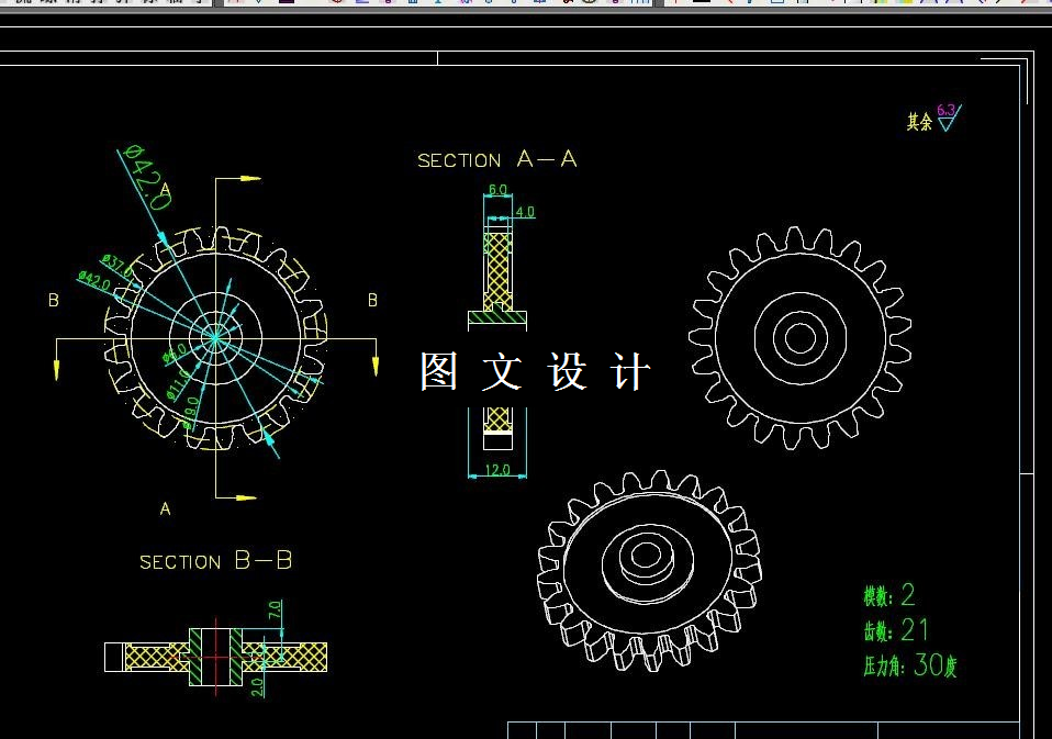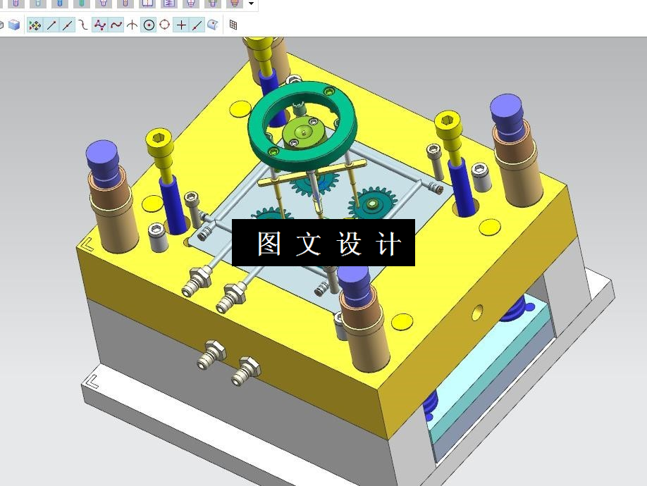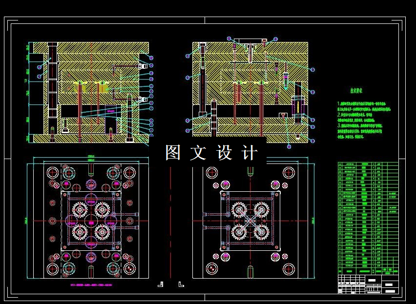 本次设计的产品为带嵌件的齿轮,具有重量轻,强度高,耐腐蚀,易清洁等 特点,为大批量生产产品。本次设计在针对产品进行工艺性分析后,确定模具分 型面、 型腔数目、 浇口形式、 位置大小;采用一模四腔,点进胶,推杆退出,三板模的设计方案。