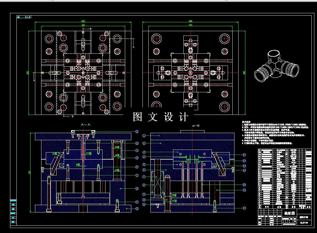 过大量的计算以确定模具复杂的结构和尺寸,通过不断的计算与修改,并在指导老师的悉心关怀和耐心指导下进行多次的反复修改,最终画出了装配图和零件图。 该模具采用一模四腔、滑块侧抽芯的设计方案。然后针对该方案进行了重点讨论。