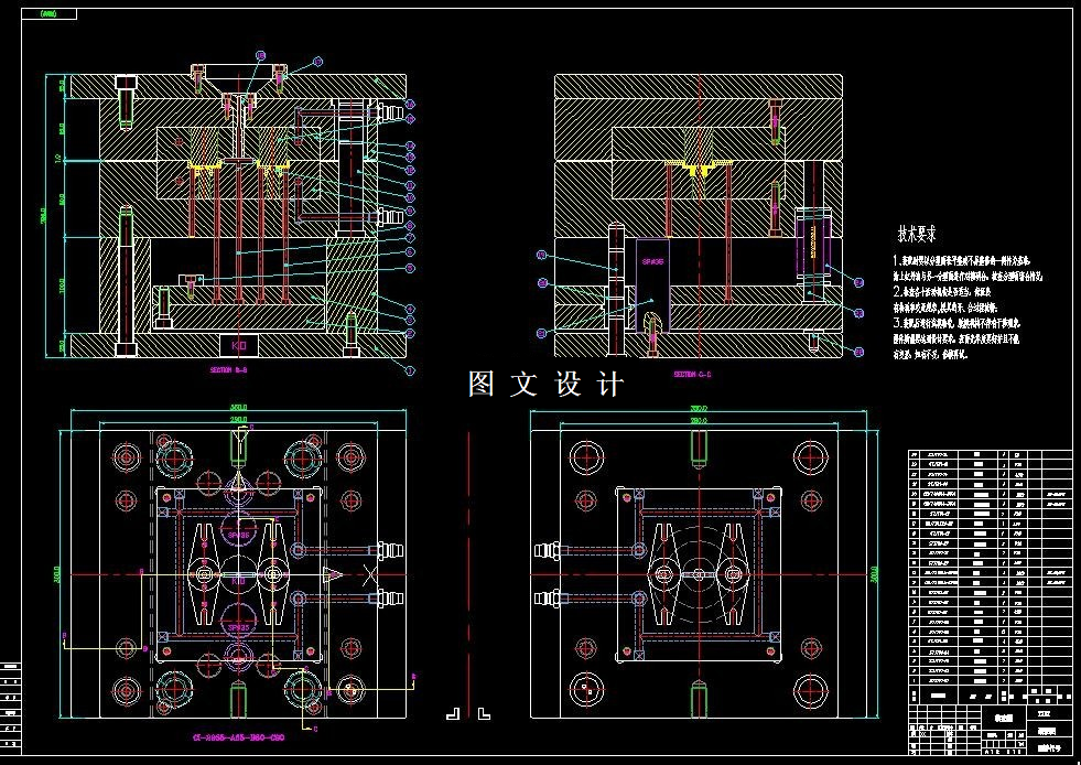 用了一模二腔的结构布局形式,该方案结构简单可靠。对于本文重点的模具设计七大系统,分别采用了侧浇口的浇注系统;采用冷却水道来降低温度,控制注塑成型周期;在成型系统零部件的设计上,采用了镶嵌式的型芯和型腔,这两个核心零部件采用专门的模具钢材制造与加工,寿命更长久;对于顶出脱模系统的设计上,仍然采用最高效的顶杆顶出机构来实现;本套设计重点完成了抽芯机构的设计,实现了对塑件特殊结构的成型设计。