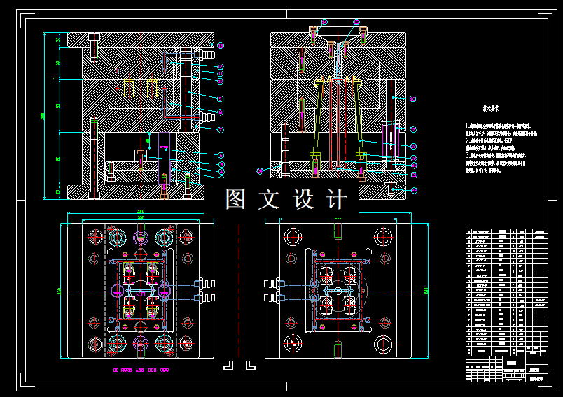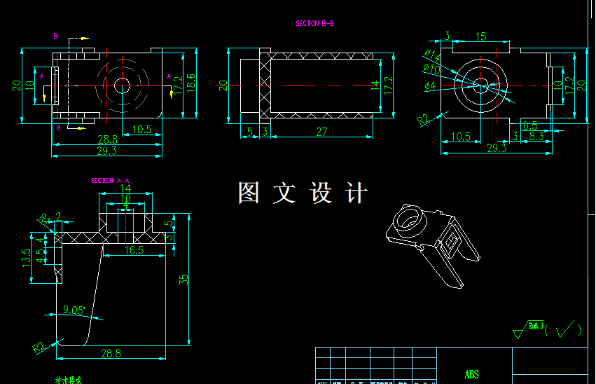 该模具适合采用一模四腔模具结构,采用单点侧浇口注胶,塑件脱模取出后,浇注系统凝料与塑件人工切除。在设计过程中,我们先对固定板塑件进行工艺分析,来选取合适的模架和注塑机等等。