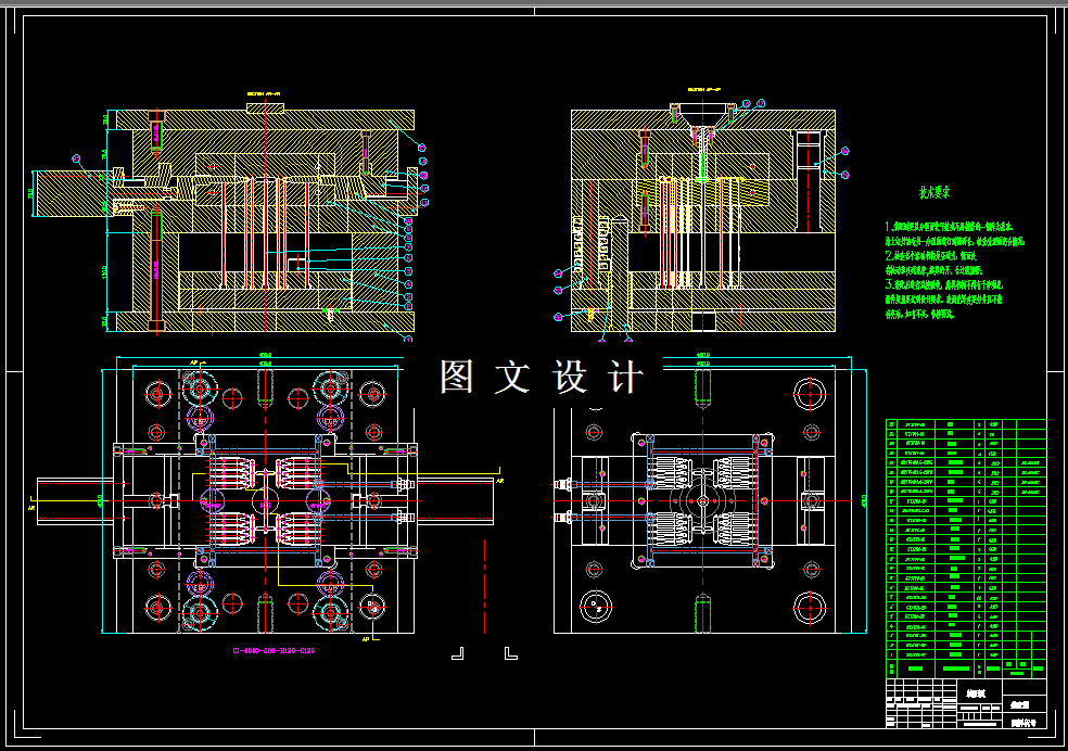 为保证塑件表面质量采用侧浇口,因此选用单分型面注射模,侧浇口自动脱模结构。模具的型腔采用一模四腔平衡布置,浇注系统采用侧浇口成形,推出形式为十六推杆推出机构完成塑件的推出。