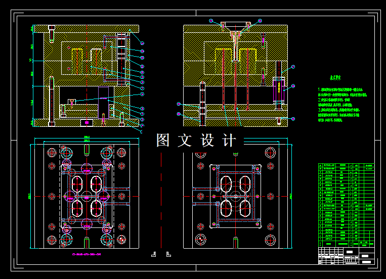通过考虑成型的经济性、可行性等因素,确定模具的型腔数为一模四腔;根据塑件特点确定模具的浇注系统和分型面位置;该模具采用侧浇口、结构简单、易于制造;通过合理布置温度控制系统,调节模具工作温度,提高塑件的成型质量;利用推杆将塑件从模具中推出;结合塑件特点和模具其他零部件的特征选择模架,并对其进行校核;