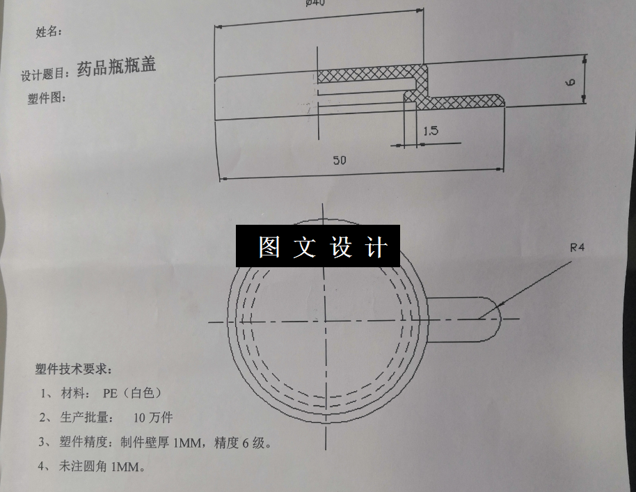 本次设计的产品为药瓶瓶盖,具有重量轻,强度高,耐腐蚀,易清洁等 特点,为大批量生产产品。本次设计在针对产品进行工艺性分析后,确定模具分 型面、 型腔数目、 浇口形式、 位置大小; 其中最重要的是确定型芯和型腔的结构, 以及它们的定位和紧固方式。此外还进行了脱模机构的设计,合模导向机构的设 计,冷却系统的设计等。最后绘制完整的模具装配总图和主要的模具零件图及编 制成型零部件的制造加工工艺过程卡片。