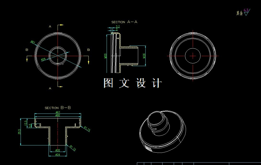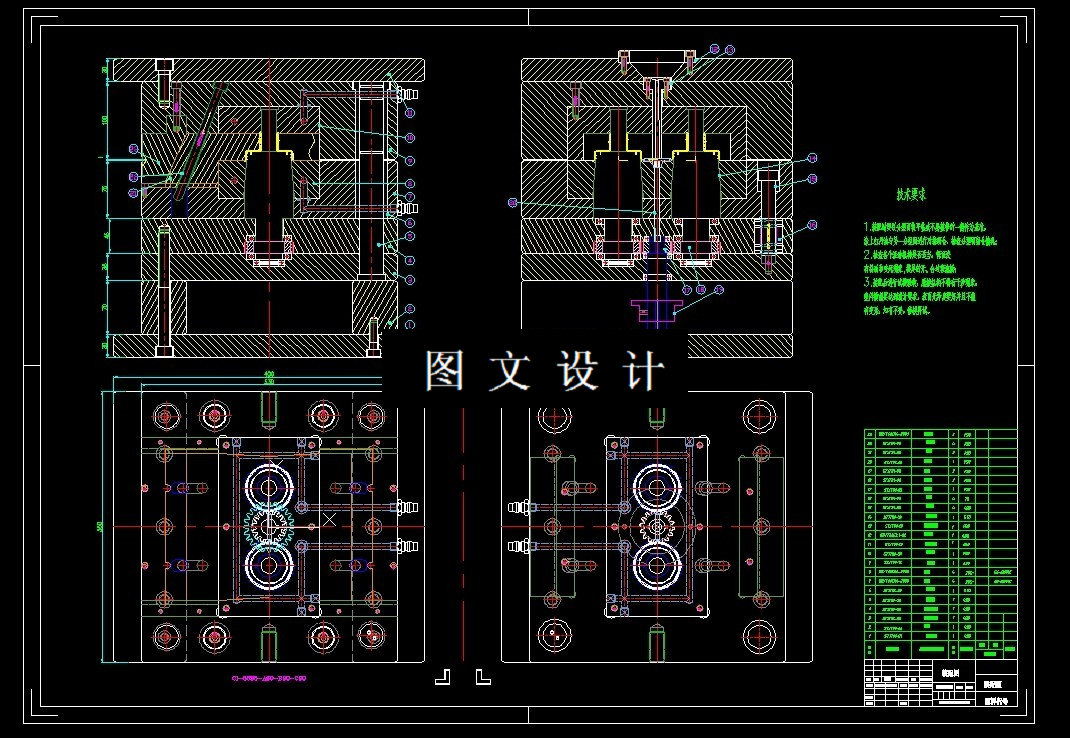 本次设计的产品为杯盖,具有重量轻,强度高,耐腐蚀,易清洁等 特点,为大批量生产产品。本次设计在针对产品进行工艺性分析后,确定模具分 型面、 型腔数目、 浇口形式、 位置大小; 采用的是一模两腔,液压马达螺纹抽芯的方式进行设计。