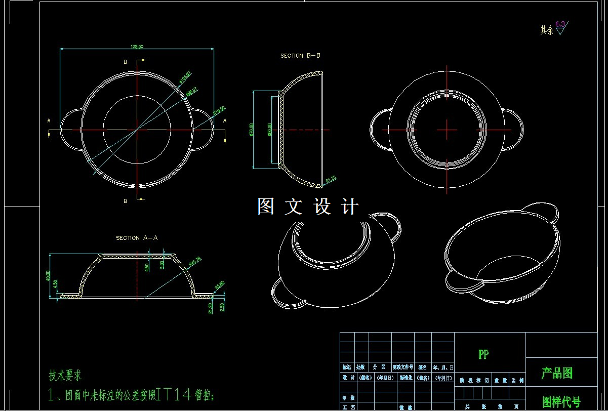 创意双耳碗注塑模具设计-一模两腔,三维图,二维图,完整的一份设计。点进胶,推板推出的方案设计,实物可以淘宝买到。本次毕业设计的课题为创意双耳碗注塑模具设计,主要在对塑件进行成型分析的基础上从原材料分析、成型特性、分型面的选择、浇注系统的设计、冷却系统的设计、型芯和型腔的结构设计、推出复位结构的设计和导向机构的设计等多方面详细阐述了创意双耳碗注塑模具的设计过程。