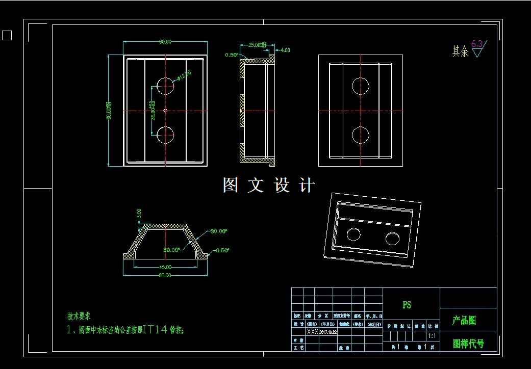 塑料壳体注塑模具设计图纸-一模四腔。点进胶,推杆推出的设计方案,图纸做的比较精细,欢迎下载学习,塑件形状较简单,重量较轻,生产批量较大。所以应使用多型腔注射模具。所以模具采用一模四腔、双列直排,推件板推出,流道采用平衡式。这样模具尺寸较小,制造加工方便,生产效率高,塑件成本较低。
