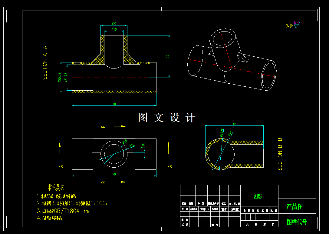 水管三通接头注塑模具设计-一模两腔,侧进胶,滑块侧抽芯的方案设计。本次设计在针对产品进行工艺性分析后,确定模具分 型面、 型腔数目、 浇口形式、 位置大小; 其中最重要的是确定型芯和型腔的结构, 以及它们的定位和紧固方式。此外还进行了脱模机构的设计,合模导向机构的设 计,冷却系统的设计等。