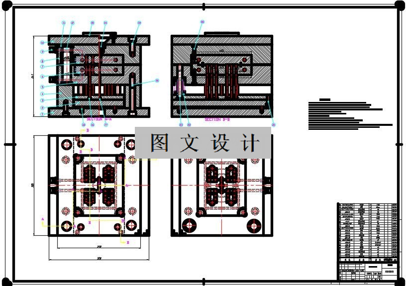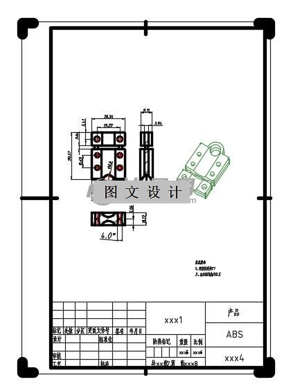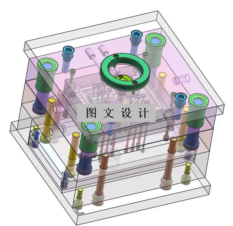 在本设计中进行了塑件工艺性分析、总体方案的设计、注塑机的选择、浇注系统的设计、成型零件的设计、脱模机构的设计、导向和定位机构的设计、模架的选择、冷却系统的设计和计算等设计工作。在本次设计中,采用一模4腔,侧交口。推杆推出的方式,进行综合设计