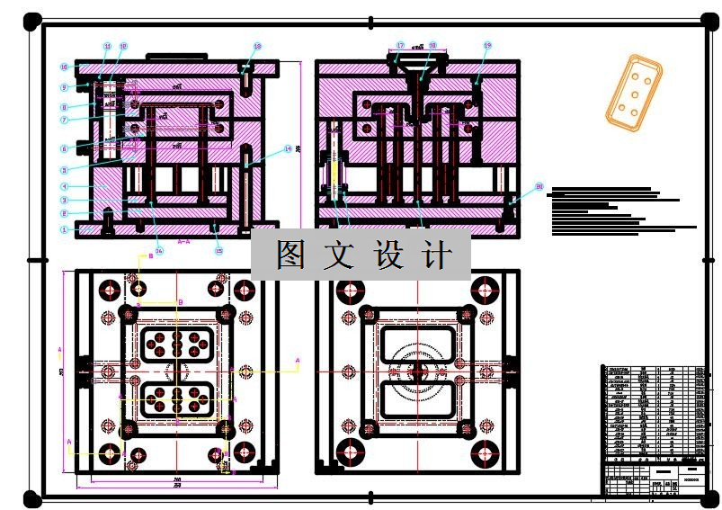在本设计中进行了塑件工艺性分析、总体方案的设计、注塑机的选择、浇注系统的设计、成型零件的设计、脱模机构的设计、导向和定位机构的设计、模架的选择、冷却系统的设计和计算等设计工作。在本次设计中,采用一模2腔,侧交口。推杆推出的方式,进行综合设计