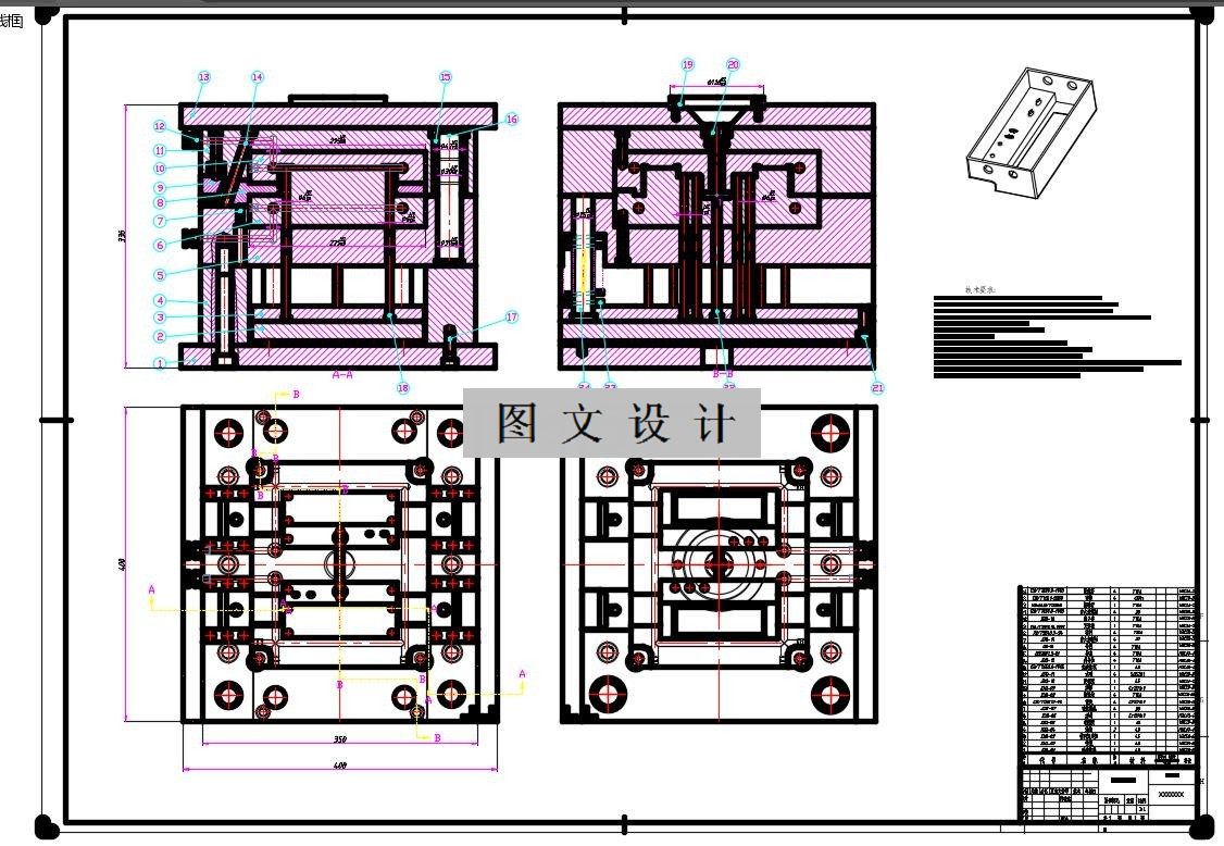 在本设计中进行了塑件工艺性分析、总体方案的设计、注塑机的选择、浇注系统的设计、成型零件的设计、脱模机构的设计、侧抽芯机构的设计及计算、导向和定位机构的设计、模架的选择、冷却系统的设计和计算等设计工作。在本次设计中,需要加工的工件两个测孔,采用了一个滑块组成的侧抽芯机构。