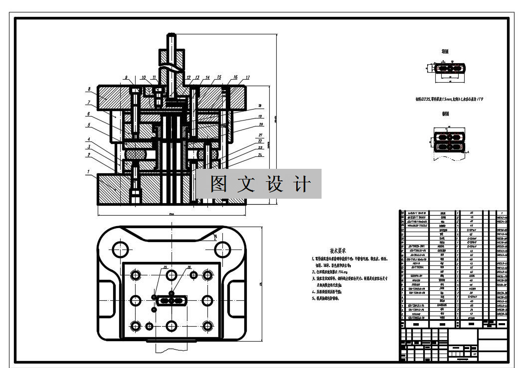 在文档中第一部分,主要叙述了冲压模具的发展状况,说明了冲压模具的重要性与本次设计的意义,接着是对冲压件的工艺分析,完成了工艺方案的确定。第二部分,对零件排样图的设计,完成了材料利用率的计算。再进行冲裁工艺力的计算和冲裁模工作部分的设计计算,对选择冲压设备提供依据。最后对主要零部件的设计和标准件的选择,为本次设计模具的绘制和模具的成形提供依据,以及为装配图各尺寸提供依据。通过前面的设计方案画出模具各零件图和装配图。