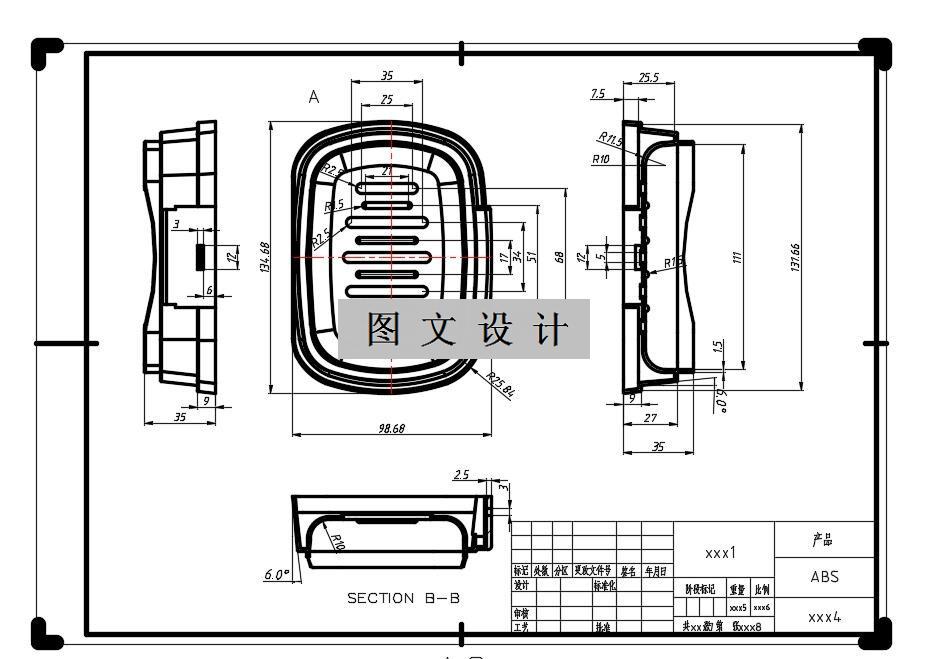 在这个设计的过程中,如何选择注塑设备是很必要的。通过对各项数据的计算核对,才能应用到我们的实际生活中。 此次设计最终选择确定的塑件材料为ABS,ABS的综合性能比较好,它无毒、无味,形成的塑料制件具有较强的力学性能。ABS的密度在 1.02到1.05g/cm3之间,收 缩 率在0.3到0.8%之间。它的流动性好,容易成型。在模具内的凝固速度较快,大大缩短了模塑周期。 ABS的热性能也很好,它的温度变化缓慢,使它具有很好的的耐低温性能和保温性能。ABS的机械强度很很高。ABS也有非常优秀的物理性能和化学性能。