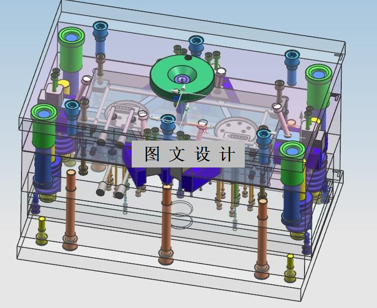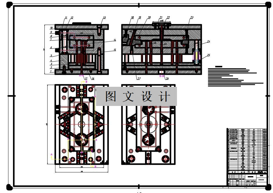 在本设计中进行了塑件工艺性分析、总体方案的设计、注塑机的选择、浇注系统的设计、成型零件的设计、脱模机构的设计、侧抽芯机构的设计及计算、导向和定位机构的设计、模架的选择、冷却系统的设计和计算等设计工作。在本次设计中,需要加工的工件采由于产品三个支脚上倒扣,用了一个滑块组成的侧抽芯机构,。