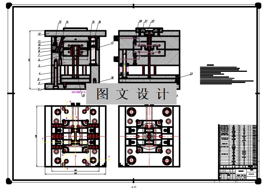 此次整体结构设计的主要内容是:模具分型面的设计、流道的布置、浇口位置的选择、模具工作零件的结构设计和它们的理论计算,还有其他重要部件的设计将会在零件图中,计算的数据在零件图中也会更加具体。设计中会使用到一些制图软件,例如UG、AutoCAD等,制图软件是用来绘制探头零件模具的三维立体结构图以及它的二维总装图的,还有探头零件的部分零件图也要绘制。