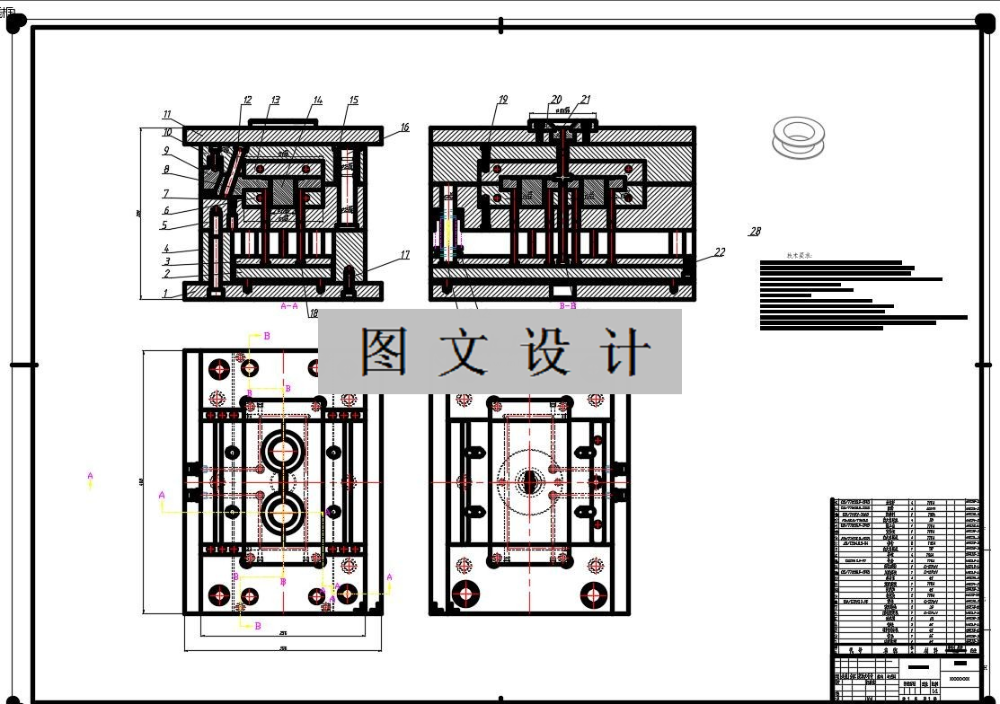 将一副注射模设计出来首先要分析材料的有哪些工艺性能,然后分析模具的成型工艺。再把所有的零件按照尺寸在AutoCAD中设计出来,将设计的零件组装起来成为一副完整的注塑模。本次选题是塑料骨架,骨架的壁厚均匀、尺寸适中,故采用一模两件使生产效率得到提高。用滑块侧抽芯,推杆推出机构。因型芯的尺寸大,采用强度足够整体式型腔。使注塑工艺更加简化,整体布局紧凑。