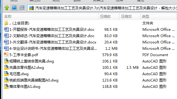 本设计的主要内容是对给定的汽车变速箱箱体进行工艺规程程设计,并编制相应的工序卡片。其中包括拟定加工工艺路线,包括加工方法、定位基准选择、机床、刀具的选择及专用夹具设计。根据工艺要求设计并绘制指定工序的专用夹具装配图。要求结构合理,工作效率高,制造方便,尽量降低成本和制造难度,并对夹具精度和技术经济性进行分析。机床夹具的首要任务是保证加工精度,特别是保证被加工工件的加工面与定位面以及加工表面相互之间的位置精度。在机床上使用专用夹具后可使加工变得方便,并扩大机床的工艺范围,减轻工人劳动强度,保证安全生产。