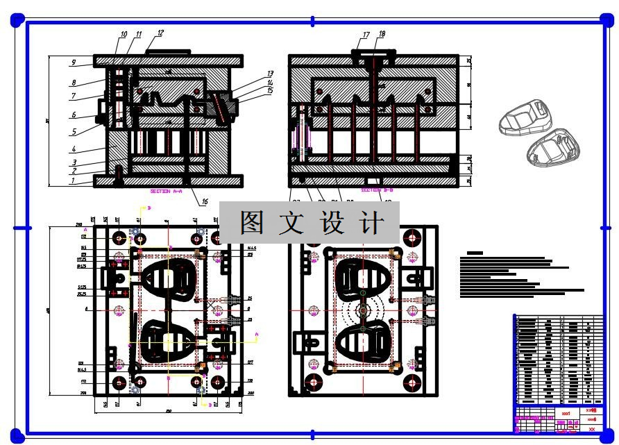 本次设计主要对充电器外壳注射模的设计,提出了模具设计的关键点,设计了模具的整体结构。根据塑件分型面的位置,设计了推杆推出结构,零件采用了单分型面的侧浇口,提高了注射的质量,以及自动化程度,提高生产质量。通过对塑件进行工艺的分析及其结构分析,从产品结构工艺性,具体模具结构出发,对模具的浇注系统、模具成型部分的结构、顶出系统、注射机的选择及有关参数的校核都有详细的设计。该模具一模两腔经过生产验证,该模具结构合理,动作可靠。