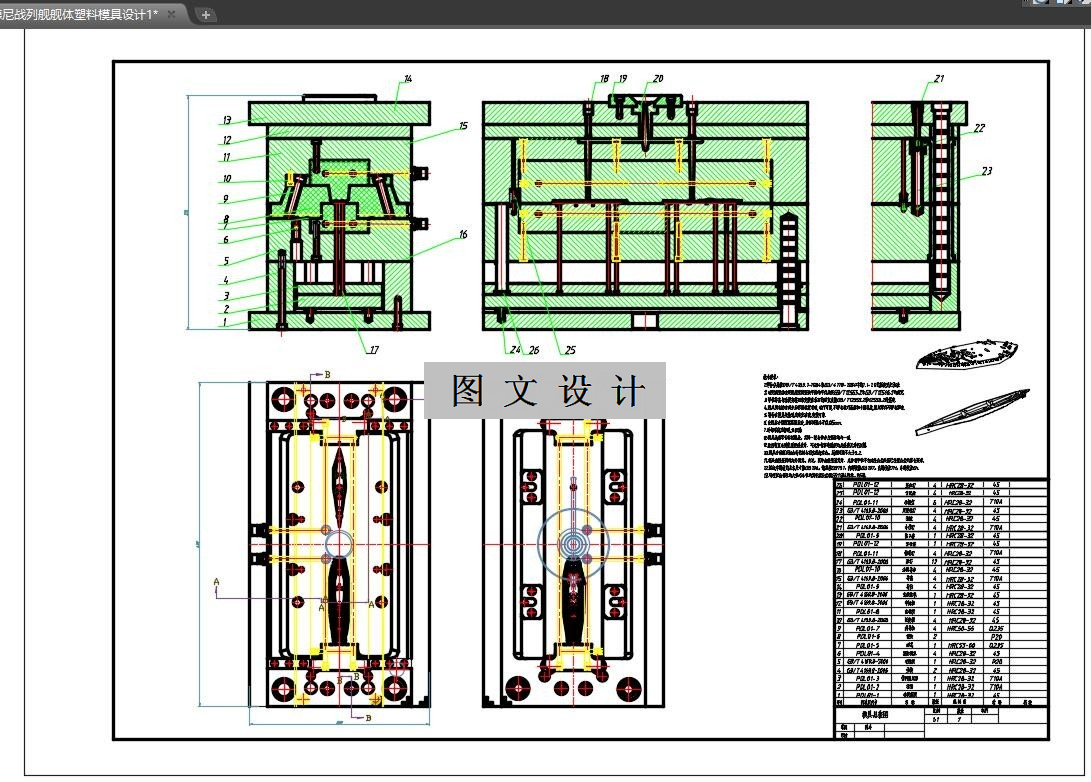 此次设计为罗德尼战列舰舰体塑料模具设计。接到课题以后首先简单地分析了零件的结构以及用途,包括设计原因,注塑成型的概念,在选取材料的时候选取了ABS为原料原因也很简单,其不含毒素也没有异味,很符合罗德尼战列舰舰体零件的要求。在分型面选取上参考了选取分型面的重要因素最终选择下端面为分型面。注射机是按照该塑件的体积以及材料的成型特点选取。浇注系统在选取是考虑到塑件的结构采用点浇口,并考虑塑料流动均匀选择了合适的点浇口位置,位置确定为塑件上端面中心位置。凹凸模设计是因为该塑件相对简单所以选择了整体式。该设计还包括冷却系统的设计选用了两根冷却水道进行冷却。脱模机构选择推杆以及排气系统确定为利用板与板之间的间隙进行排气。最主要的抽芯机构的设立采用了最常用的斜导柱分型抽芯机构。