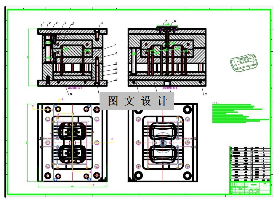 装配图应用足够说明模具构造的投影图及必要的剖面图、剖视图,一般主视图和俯视图对应绘制。还要注明必要尺寸,如模具高度、轮廓尺寸、开模行程以及装配保证的有关尺寸和精度。画出工件图,填写详细的零件明细表和技术要求。