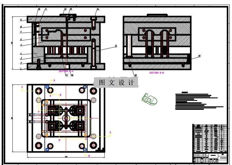 运用Auto CAD软件,按照上述几章设计的尺寸,绘制模具装配总图及各零件图。总装配图按照0#图纸绘制,零件图则按照3#等图纸绘制。图样幅面应符合国家(GB4457.1-84)标准。 先绘制装配草图,经指导老师认可,才进行正式图的绘制。绘图过程中严格按照国标制图标准绘制。 装配图应用足够说明模具构造的投影图及必要的剖面图、剖视图,一般主视图和俯视图对应绘制。还要注明必要尺寸,如模具高度、轮廓尺寸、开模行程以及装配保证的有关尺寸和精度。画出工件图,填写详细的零件明细表和技术要求。