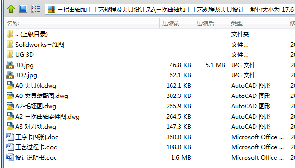 此次毕业设计任务是对三拐曲轴零件的机械加工工艺夹具的设计,主要包括对零件图的分析、毛坯的选择、零件的装夹、工艺路线的制订、刀具的选择、切削用量的确定、加工工艺文件的填写。选择正确的加工方法,设计合理的加工工艺过程。此外还对三拐曲轴零件的工序的加工设计了专用夹具.