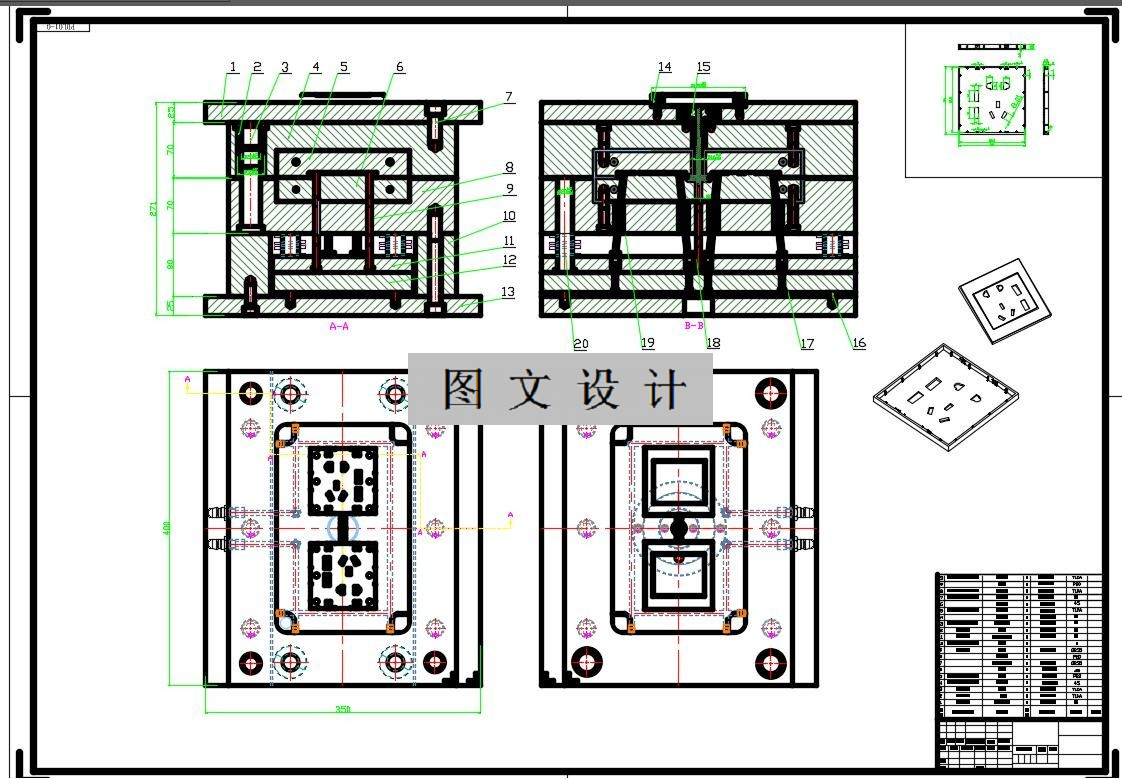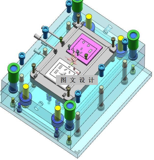 本模具的总装图工作原理:模具安装在注射机上,定模部分固定在注射机的定模板上,动模部分固定在注射机的动模板上。合模后,注射机通过喷嘴将熔料经流通注入型腔,经保压,冷却后塑件成型。开模时动模部分随动板一起运动渐渐将分型面打开,当分型面打开完毕后,凝料从上模中脱出,在注塑机顶杆的作用下,顶杆通过推杆将塑件和凝料系统顶出,与此同时由于采用的是点浇口,在顶出的瞬间,塑件和凝料分开。此时塑件自动脱落,实现全自动脱模。合模时,随着分型面的闭合复位杆将动模板复位,模具闭合,等待下一次的动作。