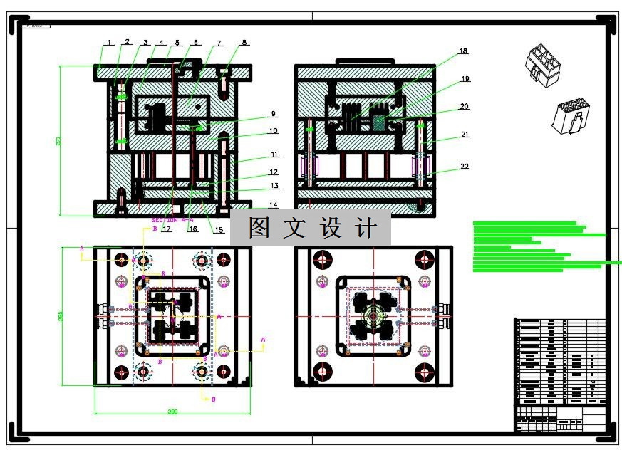 在该塑料模具设计中,系统的阐述了组件式卡扣模具的整个设计流程,其中主要包括以下几大模块:设计背景及工艺的分析,注射机的选型及工艺参数的确定,浇注系统、成型零部件、冷却系统、脱模机构等的设计以及最后对该模具进行简单的分析等。