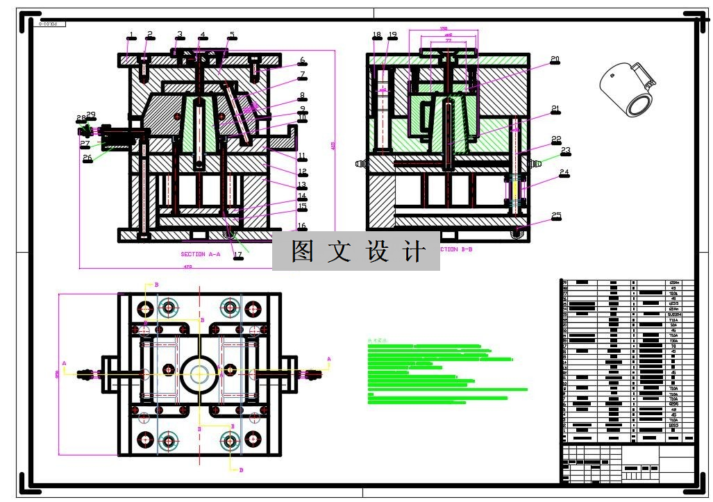 水杯注射模注塑模具的一个模块,并在三板型双分型面的一个空腔,部件的设计和计算的详细的模具零件,主要包括结构,转向机构设计,脱模机构设计,散热设计和排气系统的设计。由于在特殊形状的水杯注射模,这套模具是通过抽芯的形式,确保顺利脱模。设计有三维图纸,加ug三维