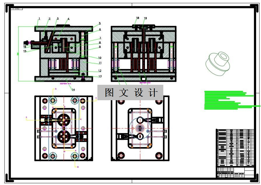 在本设计中进行了塑件工艺性分析、总体方案的设计、注塑机的选择、浇注系统的设计、成型零件的设计、脱模机构的设计、侧抽芯机构的设计及计算、导向和定位机构的设计、模架的选择、冷却系统的设计和计算等设计工作。在本次设计中,需要加工的工件有侧孔,采用了一个由侧型芯、固定件、挡块组成的侧抽芯机构,避免了采用斜导柱结构。