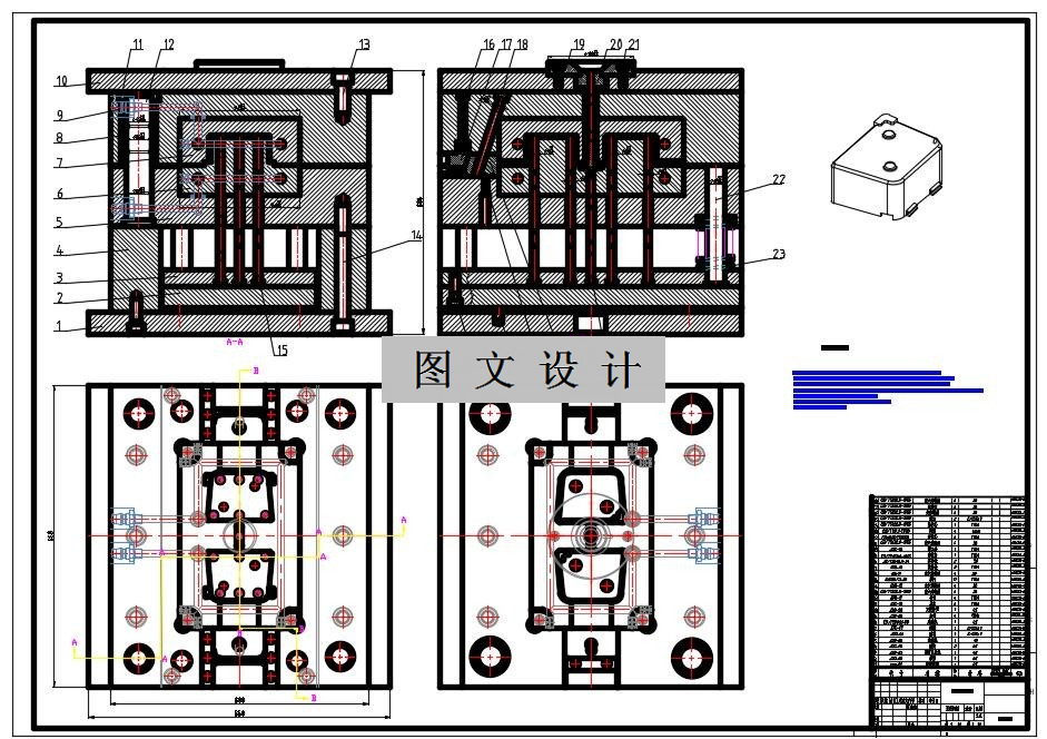 本设计主要设计要点如下:底座的设计比较的合理;分型面的选择有利于底座成型;脱模机构的设计不但结构简单,而且脱模动作稳定可靠;进浇口的选择不影响底座外观,而且保证底座充填均匀;冷却水道的设计使注塑模具效率达到最高,保证底座质量要求;在设计的过程中借用分析软件如CAD等使设计更合理、更有效;大量使用标准件,使注塑模具制作成本大大降低;