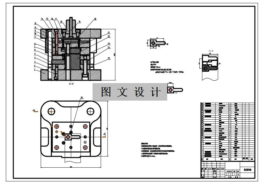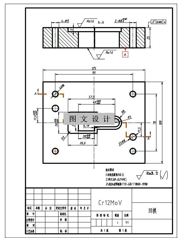 所有的设计方案确定以后开始绘制模具草图、装配图、零件图、编写技术要求、设计说明书。图纸,有cad装配图,凸模,凹模,卸料板,凸凹模固定板,凸模固定板。1460904