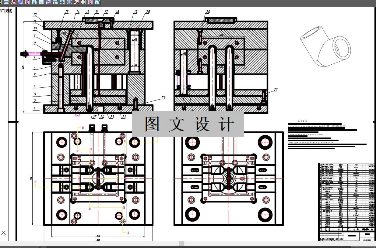 弯头A注塑模设计为,90度的弯头注塑模,塑件较小,采用一模四腔进行设计,全套资料有三维图,cad装配图,塑件图,加说明书,内容详细,完整,图纸标注详细,技术要求全面1460761