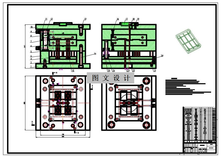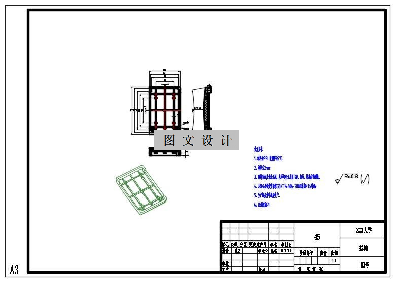 设计过程中主要涉及到了如下的内容:浇注系统设计,注射模成型零部件设计,注射模结构零部件设计,推出脱模结构设计,冷却系统机构设计等。一起有图纸和说明书