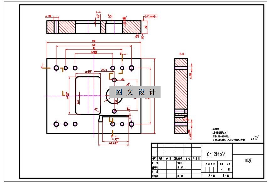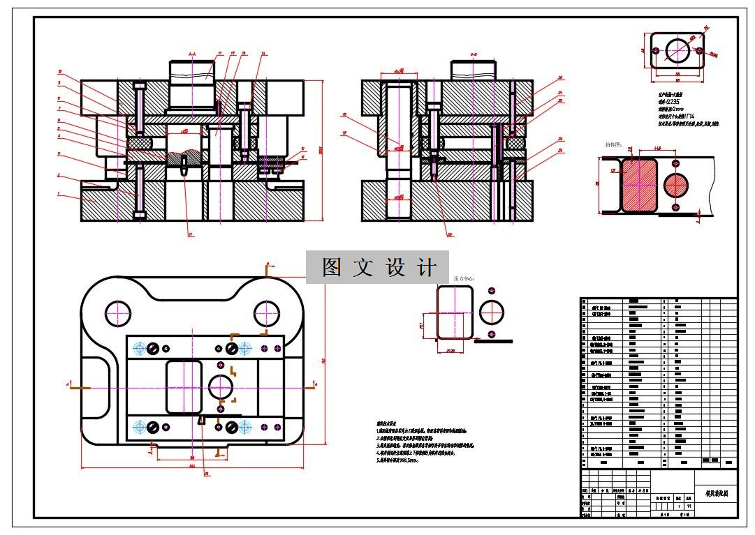 经过分析该工件采用的级进模具结构,模具设计过程中根据材料的力学性能,计算了工件所需要的冲裁力、模具压力中心;根据工件的精度等级,计算凸、凹模制造精度和刃口尺寸,根据工的外形尺寸和材料厚度,查表得出最下搭边值,进一步绘制出排样图,并计算材料利用率,同时计算出模具凹模的周界尺寸,根据凹模的周界尺寸,计算出模具其他零部件的尺寸,并选择对用的模架型号。 1460337