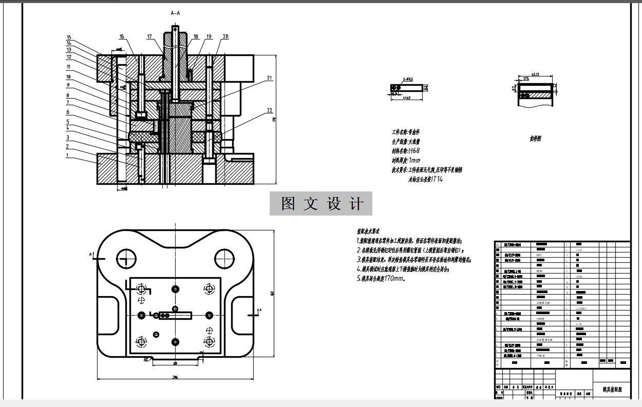 根据设计课题,课题零件为弯曲件,分析其工艺由冲孔、落料、弯曲组,课题要求弯曲工件大批量生产,弯曲工件材料为H68,材料厚度为1mm,生产精度按照IT14,结合弯曲工件的要求,作出弯曲工件的工艺分,确定工艺方案,选择模具结构,计算工艺相关参数,设计模具零部件。 1460336
