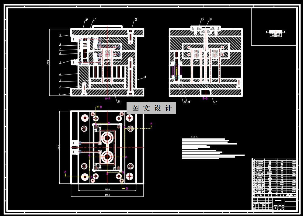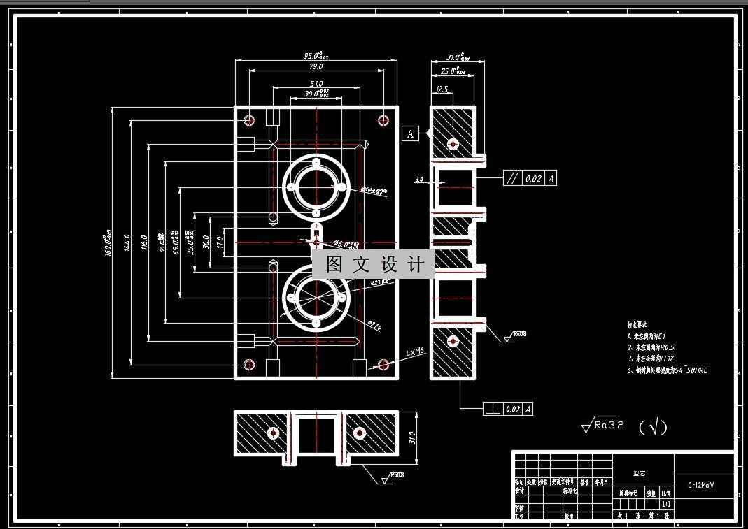 1)首先画出模具中心线及模具主视图及侧视图外形线。确定动模与定模的分型面,确保塑件留在动模一侧。画出塑件位置及定模、动模型芯。画出流道及浇口。 2)在动模投影平面上画出塑件位置,并在主视图上表示各零件之间的装配关系。 3)画出所有零件的引线,并顺序标出零件序号。 4)填写标题栏、明细表内容,包括件号、名称、材料、件数及标准件规格、数量等。 5)编写技术要求,包括装配要求及试模要求。注明注射机规格及标准模架代号。1459668