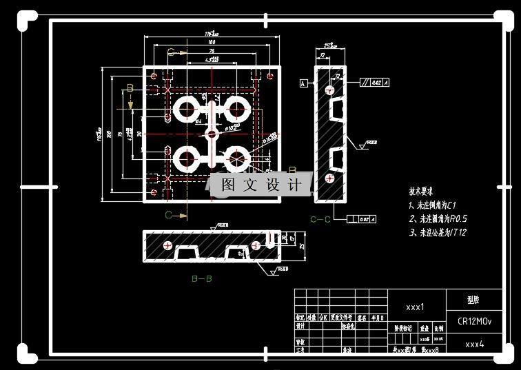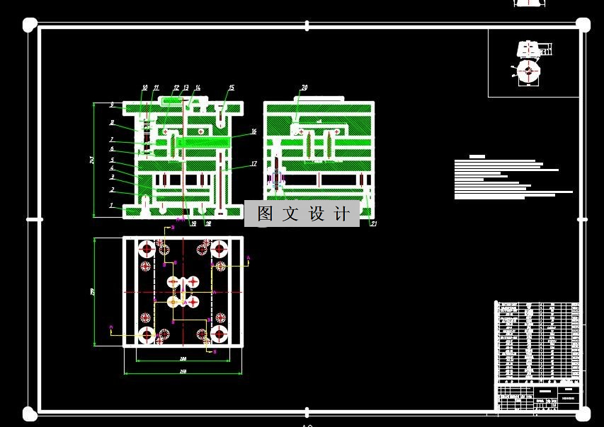装配图是模具装配的主要依据,其要求为: 尽可能按1:1比例绘制,并应符合机械制图国家标准。 绘制时先由型腔开始绘制,主视图与其它视图同时画出。为了更好地表达模具中成型塑件的形状、浇口位置等,在模具总装图的俯视图上,可将上模(或定模)拿掉,而只画出下模(或动模)部分的俯视图。