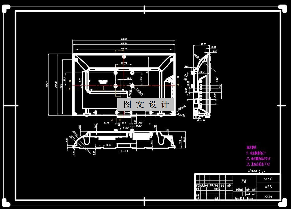 a. 绘出塑件零件图。 b. 完成注射模具装配图设计。 c. 绘出所有成型零件图。 d. 设计方案的拟定。 (1)确定成型方法 (2)确定模具类型及型腔数 (3)型腔的布置 (4)选择注射机的规格。包括对注射机几个参数的校核 (5)确定分型面 (6)确定浇注系统和排气系统 (7)选出顶出方式及抽芯机构 (8)确定拉料杆形式 (9)确定加热与冷却系统