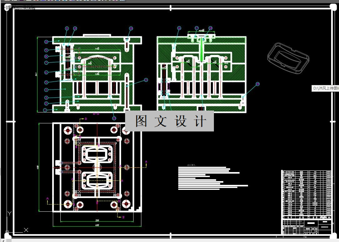盒盖是一模2腔,侧浇口,推杆退出,设计一起有模具三维,加二维的cad图,装配图,型芯,型腔,塑件图,说明书,全套资料全面,合理,尺寸标注详细。1459254