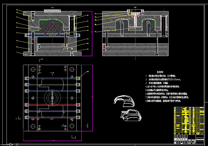 其次,根据完成的实体图进行模具设计,在进行模具设计时,根据塑件的形状并结合手册循序渐进的进行模具设计。这次模具设计是对以前所学知识的一次实践。由于我没有实践经验所以很多东西都要依靠手册。包括数据的选取和工艺性的确定。模具设计包括浇注系统、冷却系统及动、定个部分的结构的设计。在设计时要使用到AUTOCAD2004和Pro/ENGINEER,这些计算机辅助设计软件对于提高设计的速度和质量很有帮助,这也是当今模具行业发展的选择。