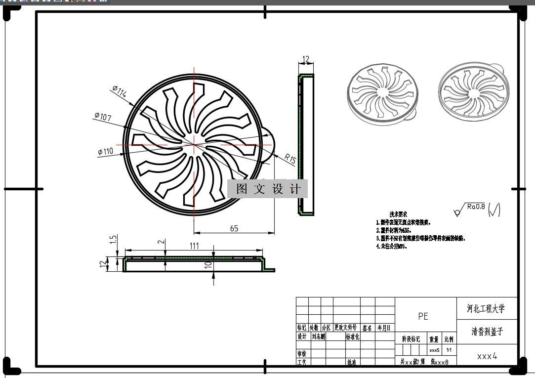本设计介绍了塑件注射成型的基本过程,对注塑产品提出了基本的设计原则;详细介绍了塑件成型工艺设计,注射机的选择,浇注系统的的设计,成型零件的结构设计,脱模推出机构的设计,冷却系统的设计的过程。通过本次设计,使我掌握了注塑模具设计的全过程,同时也提高了运用CAD绘制复杂装配图的能力。