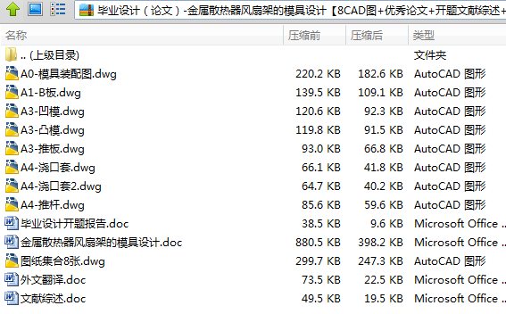 本次金属散热器风扇架设计中计算及说明部分包括如下:分型面及动、定模板结构型式的选择;冷却系统结构形式的确定;浇注系统结构形式的确定;模具型腔、型心结构的确定;自动脱螺纹机构形式的确定;注塑机的选择;排气系统结构的确定。