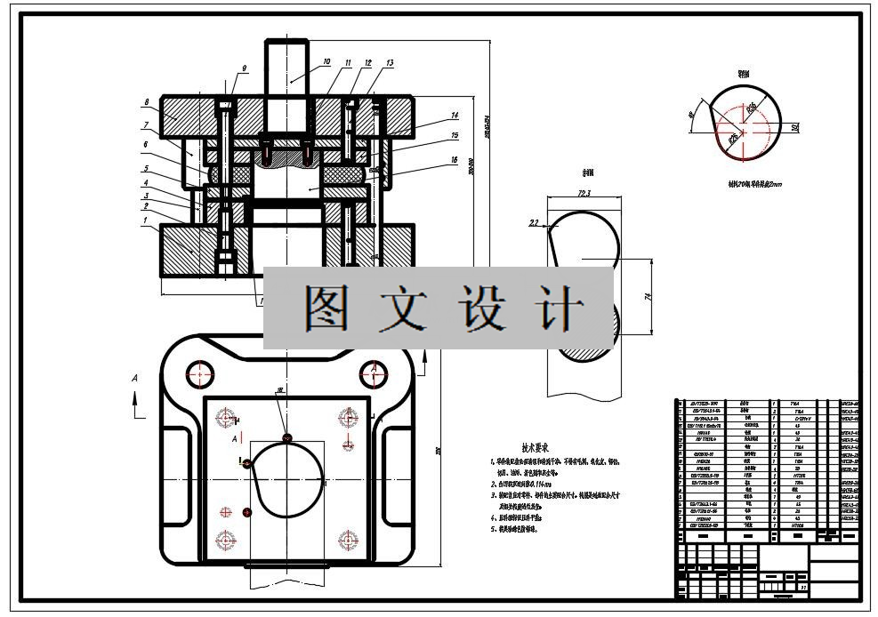 凸轮是落料模具,主要有装配图,凸模,凹模,卸料板等图纸,还有设计说明书,设计说明书一万字,内容合理详实,凸出重点,计算正确,图纸标注详细。技术要求填写合理