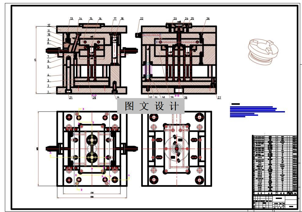 本文研究的是活动圈的注塑成型。首先分析产品的成型工艺,然后根据产品结构,设计如何分型,及型腔数目,进胶方式。过程中要充分考虑到零件的加工方法,尽量简便精准,并进行相关尺寸的计算和校核,再设计浇注系统,冷却系统,排气系统,脱模机构,导向机构,以及模架的选择。通过CAD,UG ,等软件辅助分析设计是否合理,选择合理的工艺参数和设计方案。
