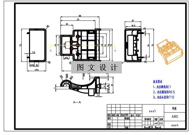 1)通过网络或图书馆查阅文献资料,相关外文资料的翻译(2000以上印刷字符以上)。 (2)绘制塑件图,对产品材料及结构合理性进行分析,制订适当的注射成型工艺; (3)计算制品的体积及重量,确定模具型腔数目,初选注射机,校核所选用注射机有关工艺参数;; (4)设计注射模具总装配图,包括确定分型面,浇注系统形式,浇口开设位置,成型零部件的结构设计,侧孔侧凹的成型方法,脱模机构、合模导向机构设计,加热和冷却系统的考虑等,以及型腔、型芯、凹模壁厚及其它零部件(如推杆、推板、推管等)的设计校核和选用,编制型腔型芯零件机加工工艺规程及工艺卡; (5)完成外文翻译,开题报告,编写设计说明书。说明书内容要求规范化,字数不少于12000字,要求文字简练通顺、观点明确、论据充分、重点突出、格式规范。 (6)结合课题设计思路制作PPT,用于答辩。